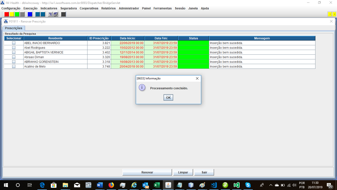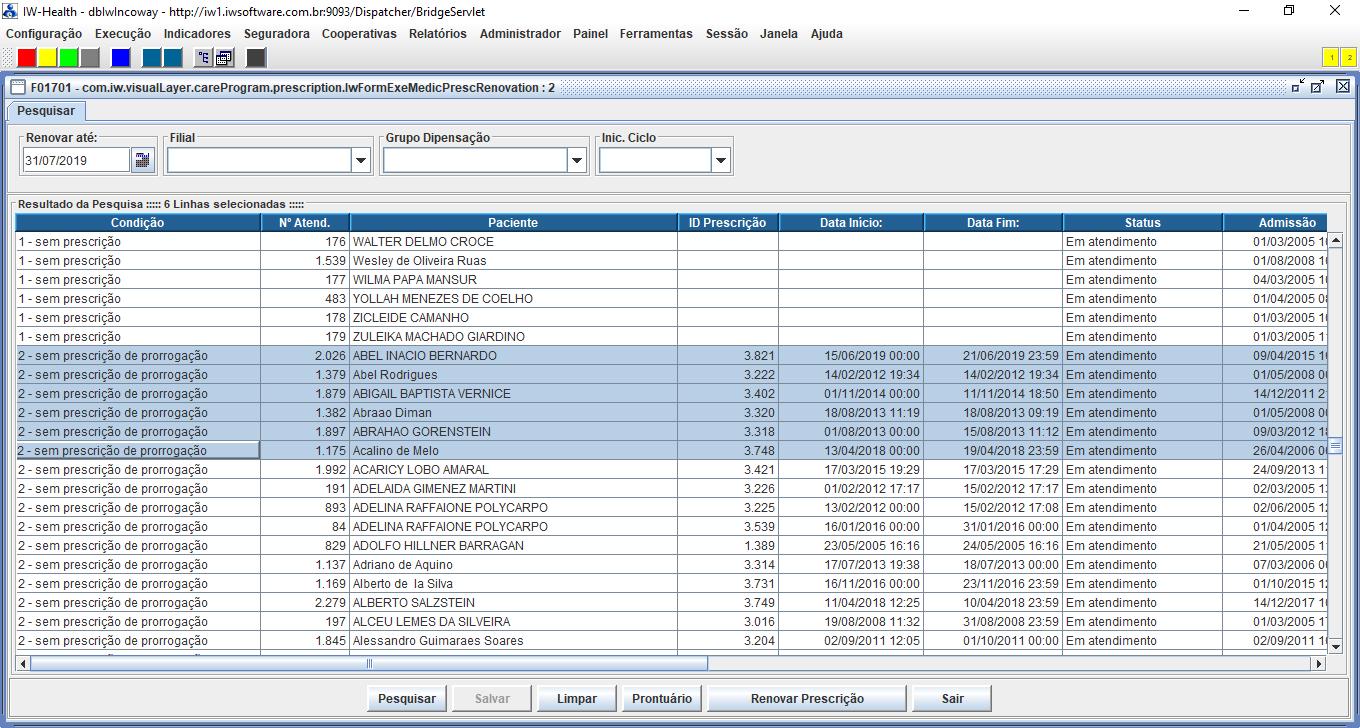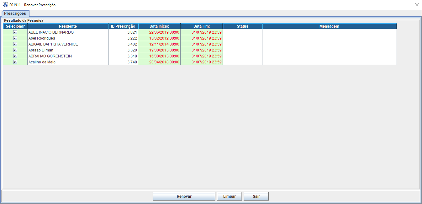 Clique no botão “Renovar” para o IW inicie o processo automatizado de geração das prescrições de prorrogação em lista. A própria interface F01911 irá indicar a progressão do processo de prorrogação das prescrições indicando na coluna “Status” se a geração da prescrição de prorrogação para cada paciente foi bem sucedida ou não (cor verde = sucesso e cor vermelha = insucesso). Em casos de insucesso será exibido no campo “Mensagem” a indicação do erro na transação de inserção da prescrição de prorrogação.