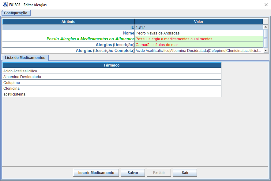 Notem a presença do atributo “Possui alergia a medicamentos ou