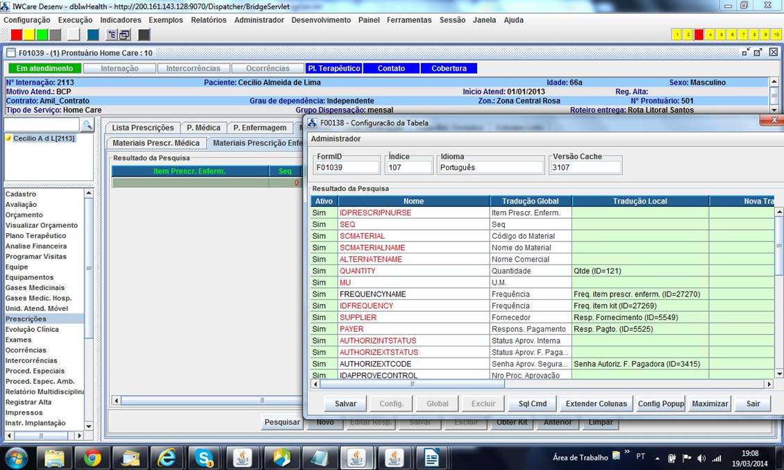 Notem o campo denominado “Índice” na caixa de diálogo F00138 na ilustração acima, essa informação corresponde ao KEYINDEX do gride no qual realizamos o lançamento da prescrição de materiais associados aos itens da prescrição de enfermagem. Para acionar essa caixa de diálogo clicamos com o botão da direita do mouse sobre o cabeçalho do gride e acionamos a opção “Configuração” do popup menu no gride).