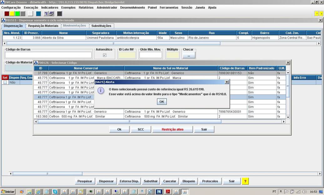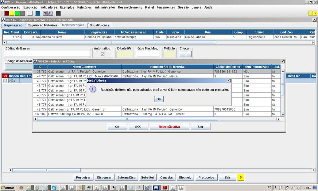 No exemplo acima tentamos selecionar um medicamento “não padronizado” com a