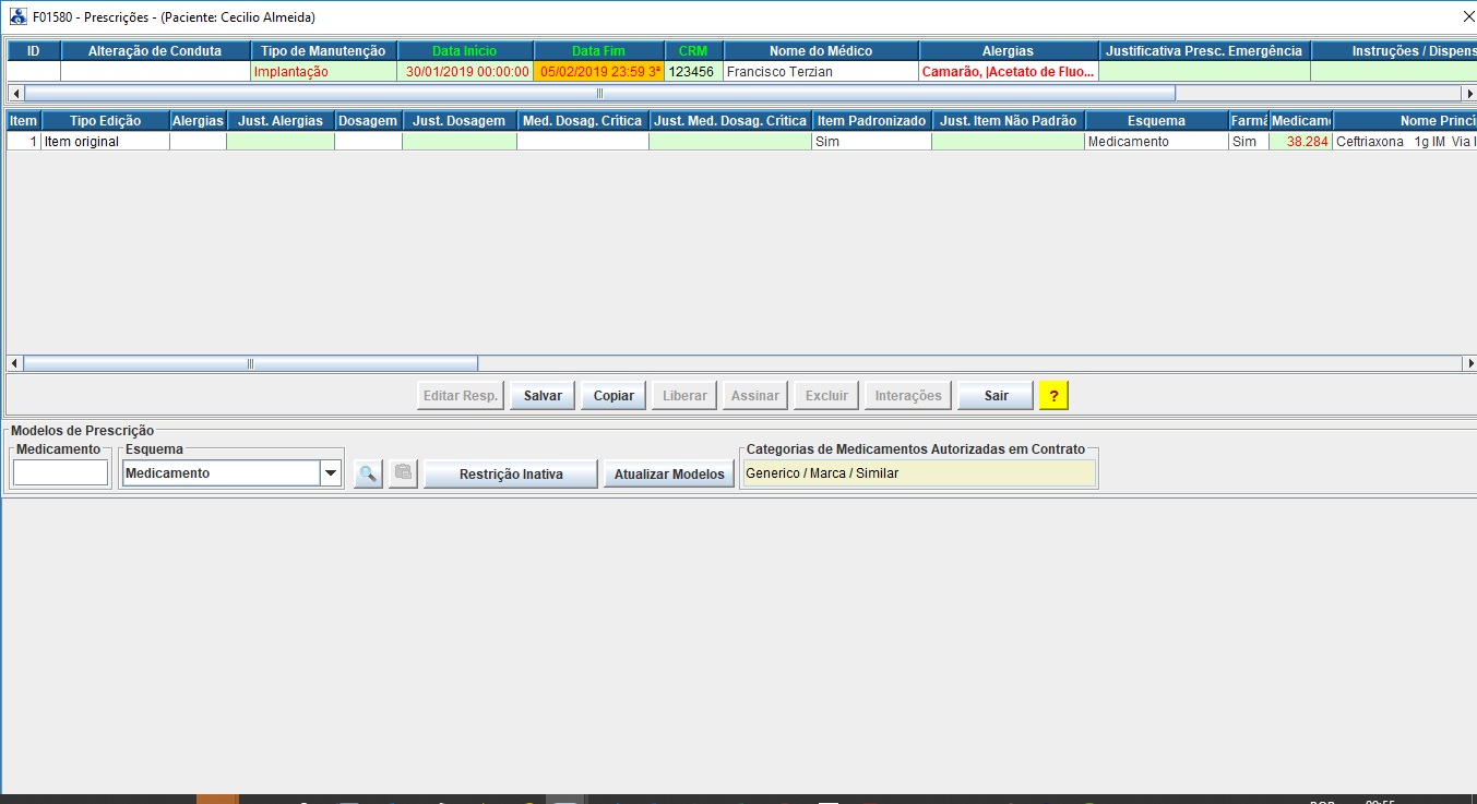liberada uma prescrição médica contendo uma medicação de dosagem crítica (vide painel de ocorrências do prontuário eletrônico